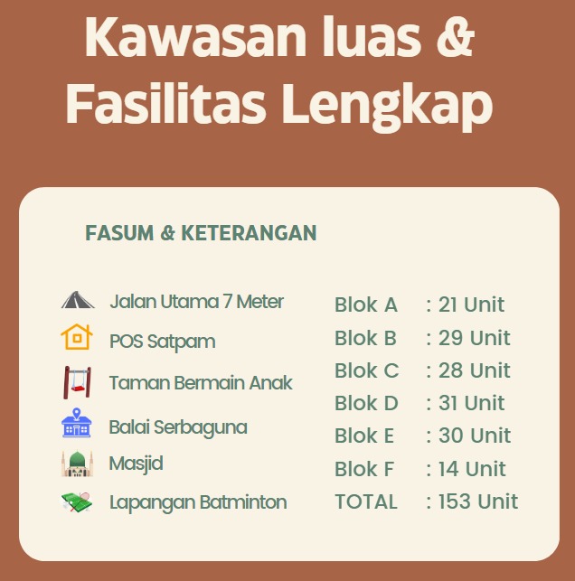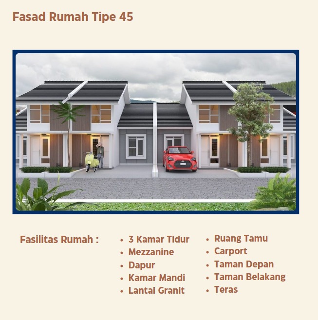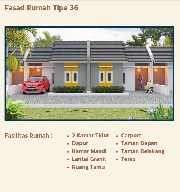 – Lokasi Strategis di pinggir kota Jogja hanya 25 menit dari titik 0 atau 13 km – Desain Modern, harga ekonomis & berkualitas – DP ringan, mulai Rp 80 ribu – Harga ekonomis, mulai Rp, 280 Juta – Harga sudah termasuk BPHTB, PPN, Biaya Balik Nama/BBN, AJB, Notaris, Administrasi dan Proses Bank, Perikatan HT, Apraisal, Asuransi*. – Tipe 36 Terbaik & Termurah dikelasnya – Angsuran KPR hanya mulai 2 juta-an/bulan – Kualitas Premium ; genteng flat beton, pintu jendela jati, lantai granit, WC duduk. – Legalitas lengkap dan terjamin – Hanya 250m dari jalan raya kaupaten – View hunian yang hijau dan asri – Kawasan yang luas (1,9 Ha) 150an Unit, dilengkapi fasilitas umum, tempat ibadah,olahraga, toko sembako, ruang terbuka hijau dan lain-lain